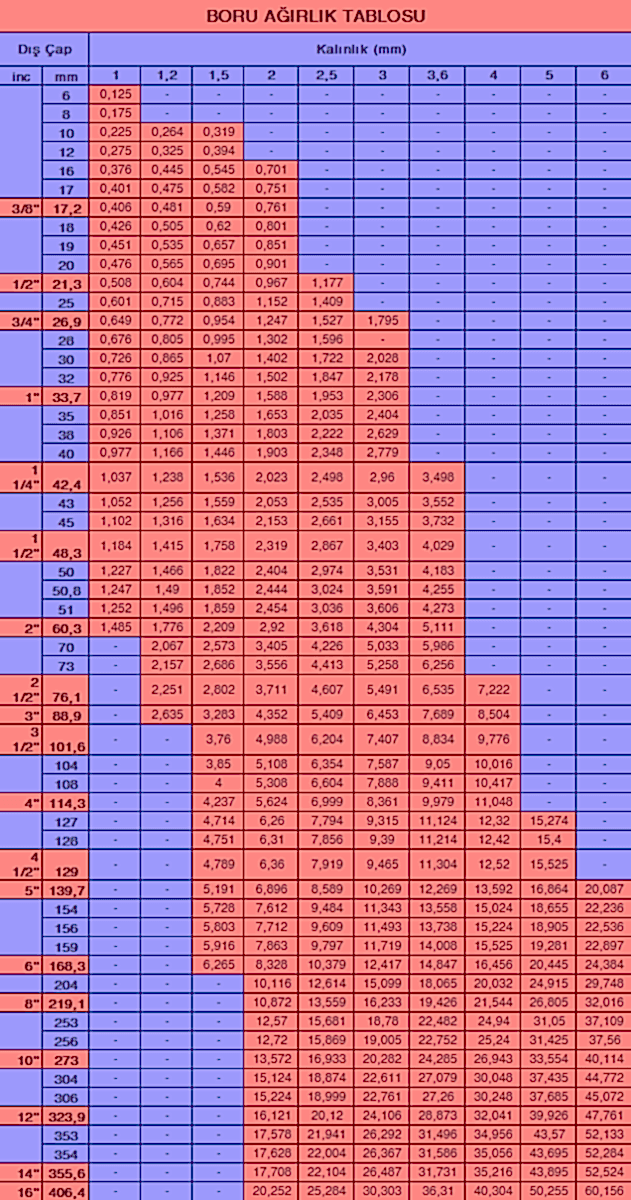 Boru Ağırlık Tablosu