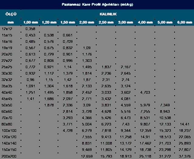 Paslanmaz Profil Ağırlık Tablosu
