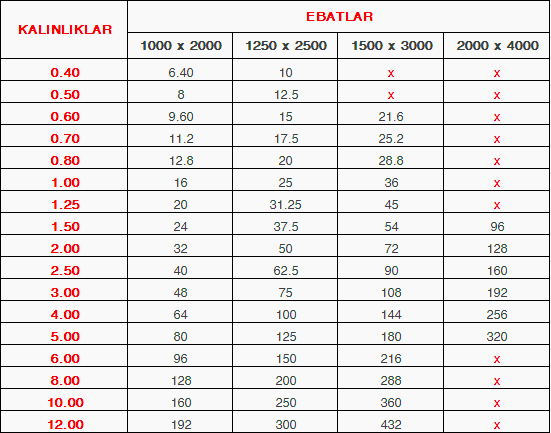 Östenitik AISI 304 304L 316 316Ti, Ferretik AISI 430, Martensitik AISI 309 309S 310 310S standart kalite, 2B mat, BA parlak, SB scoth brite, 4N ince taşlı, 3N kalın taşlı, D1 deri desen, D2 nokta desen, D3 düz kare, D4 çapraz kare yüzey, 0.30mm ile 50mm arasında kalınlık, 1000 x 2000mm, 1250 x 2500mm, 1500 x 3000mm, 1500 x 6000mm, 2000 x 4000mm, 2000 x 6000mm arasında plaka ebatına sahip ürünleri müşteri ihtiyaçlarımıza göre tedarik etmekteyiz.
